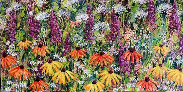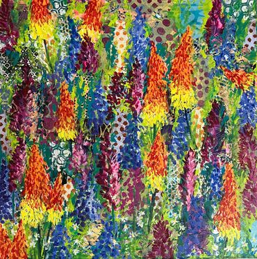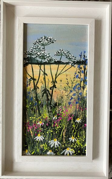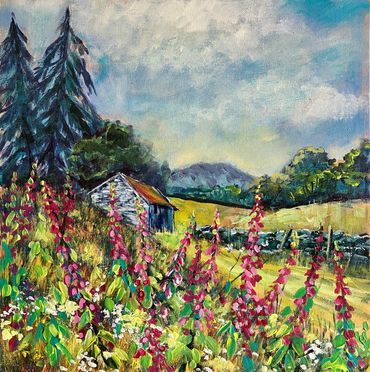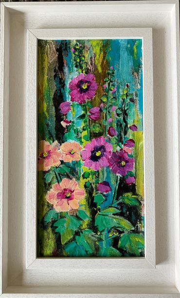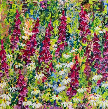 Foxglove Summer. Acrylic on board 12 ins square framed in grey moulded frame. £110