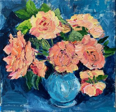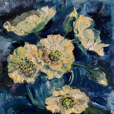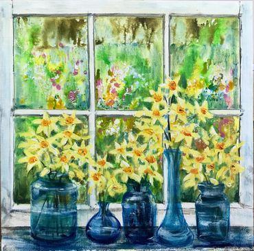 Sunflowers. Acrylic on canvas 30 cm square in cream 7 cm St Ives frame . Ready to hang £85 sold